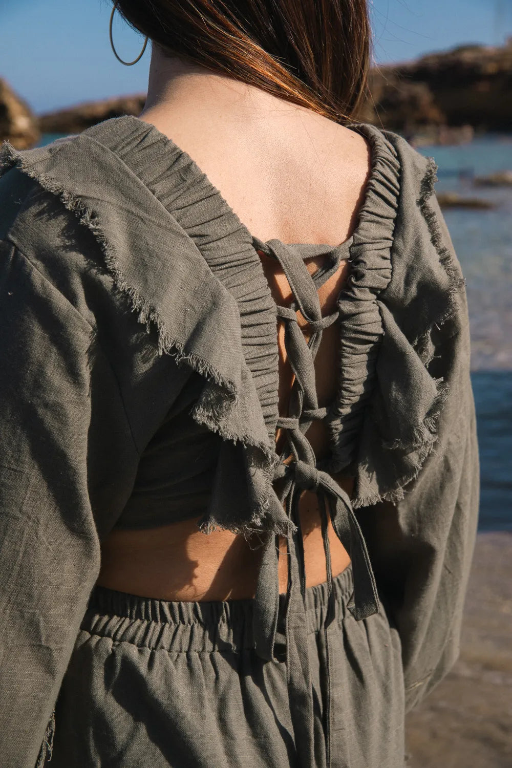 El top crop, con un favorecedor escote en V y un coqueto fruncido con volantes en los bordes, se ajusta con lazada en la parte trasera permitiendo un toque personalizado y sensual. Sus mangas largas acampanadas le otorgan un movimiento etéreo y un estilo relajado.