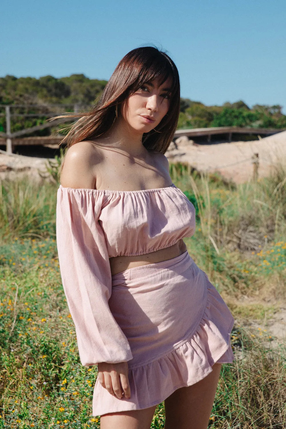 La falda, de diseño envolvente con un sutil volante en el bajo, completa el look con movimiento y feminidad. El top presenta un favorecedor escote Bardot, dejando los hombros al descubierto y añadiendo un toque romántico y sensual.Sus mangas largas con volumen le otorgan un aire bohemio y relajado.