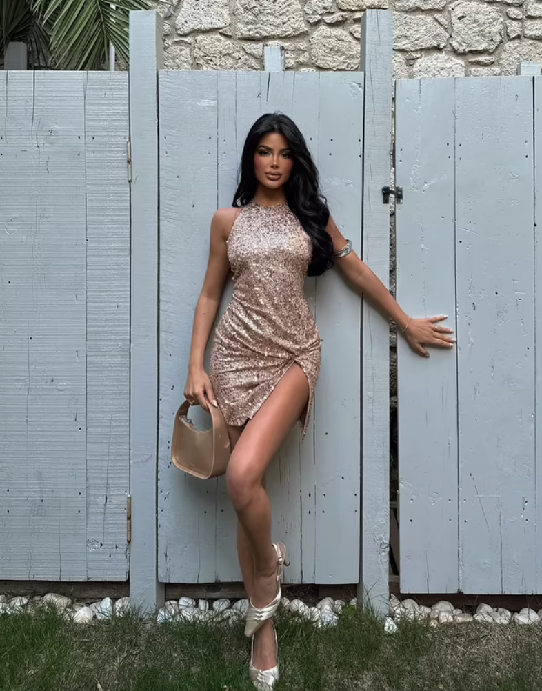 Lo más distintivo es la seductora abertura lateral en la falda, que añade un toque de audacia y permite lucir las piernas con gracia y movimiento. Ideal para las fiestas más exclusivas, una noche de baile en un club chic o cualquier evento donde el brillo sea la clave.