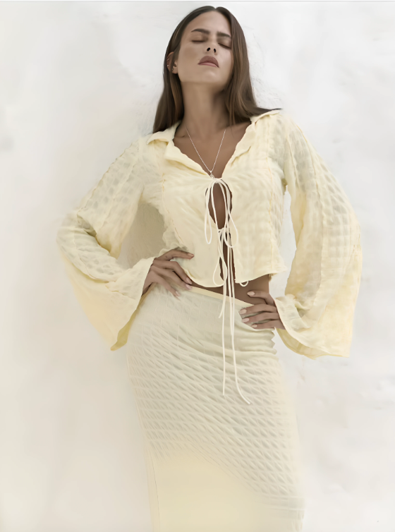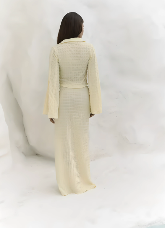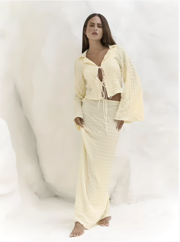 Descubre la falda que se convertirá en tu compañera inseparable este verano. Esta falda maxi de corte largo es mucho más que una prenda: es una declaración de libertad y elegancia. Confeccionada en un tejido increíblemente ligero y suave, destaca por su sutil textura acanalada que no solo le da carácter, sino que también capta la luz del sol, creando un efecto visual único y sofisticado.