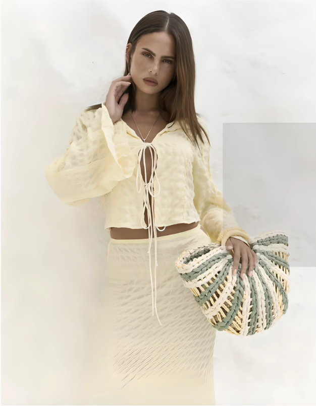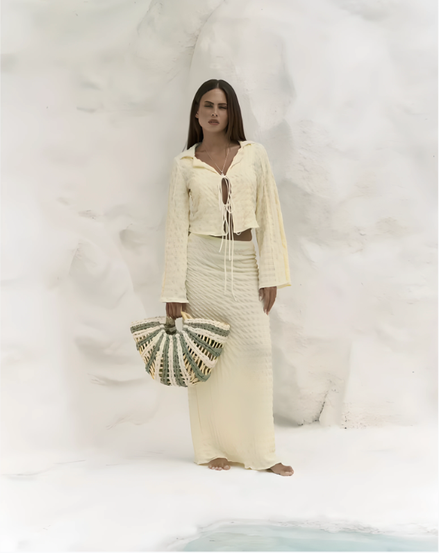 Captura la esencia de la luz y la libertad de Ibiza con este etéreo top crop. Confeccionado en un tejido ligero con una delicada textura gofre, su suave tono amarillo pálido es perfecto para los días soleados.